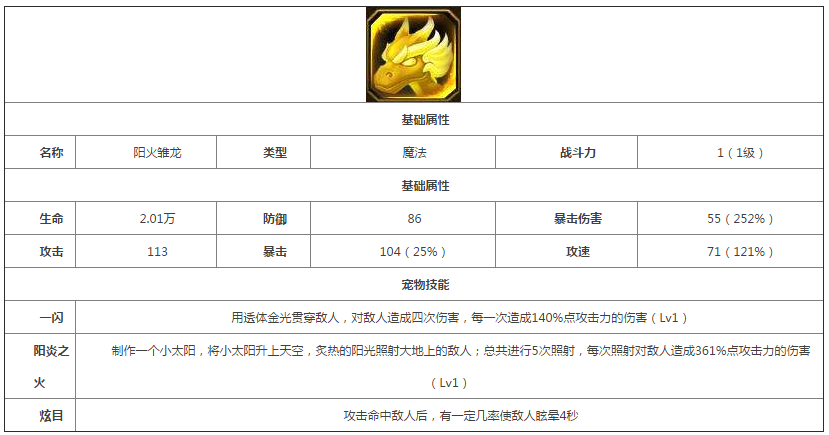 阳光雏龙宠物是金色品质、魔法类型宠物,控制效果和伤害都是比较可观的,还是值得培养的一个金色宠物。