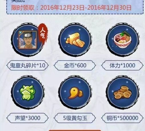1、雏田送你圣诞大礼活动奖励:鬼童丸10碎片,600金币、1000体力、3000声望、5级黄勾玉、50W铜币