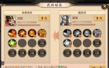 2.继承:继承会将副位武将的被动技能、等级、经验无损继承到主位武将(20级开启功能)