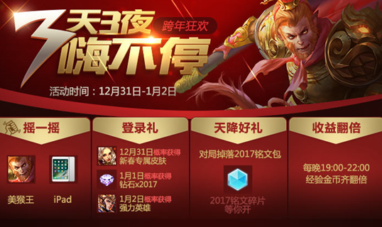 活动期间,5级以上玩家参与5V5匹配,排位赛,娱乐模式或赏金赛均能获得2017幸运铭文包,打开可以开出铭文碎片*30或铭文碎片*2017!2017好运从此开始!活动期间每日上限3个!(掉落礼包的重置时间是凌晨5点,所以聪明的召唤师,你们懂的!)