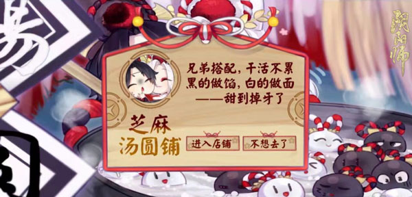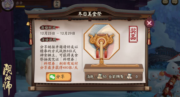 “冬日美食祭”有酒有汤有串,让人食指大动,玩家前往游戏内庭院-许愿架,点击“美食祭”灯笼即可参加活动。该H5上线后迅速引发了玩家们的分享热潮,玩家在H5中可以通过猜拳形式与美食店主进行比赛,赢了即可赢得10张料理券,每个玩家每日最多可通过H5获得480张料理券。此券可供玩家在游戏中抽取美食道具:在活动入口界面,使用活动期间获得的料理券,便有机会抽取到新推出的美食主题结界卡。美食主题结界卡为特定结界卡,可在加入阴阳寮后配置在结界中使用,除了使特定式神获取结界经验,还将掉落式神碎片等随机奖励。