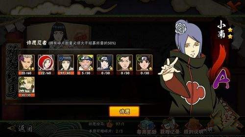 3、想要针对某个忍者进行许愿或捐赠,必须先拥有一定数量的该忍者碎片。S级忍者要求碎片数量多于50个,A级和B级忍者要求多于20个,C级忍者要求多于5个