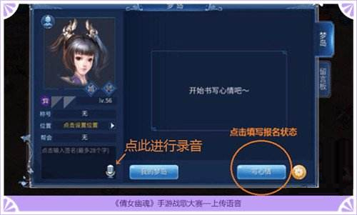 2. 在梦岛界面,在签名框内录制一段展现你天籁之声的语音形成签名,语音签名将自动存储为报名语音,点击“写心情”按钮进入报名状态填写界面。