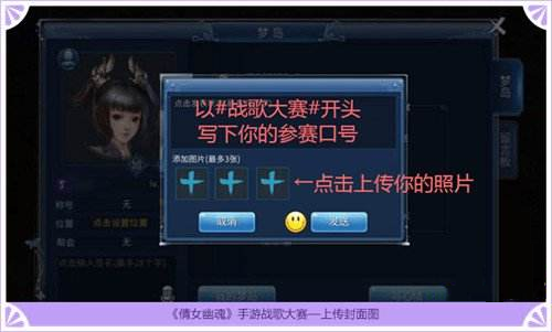 3. 话题#战歌大赛#,输入你的参赛宣言,上传一张参赛音频的封面照片,并在梦岛发布这条状态,即视为参与报名。报名成功后请等待审核!