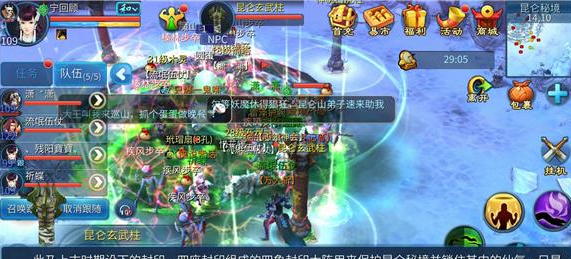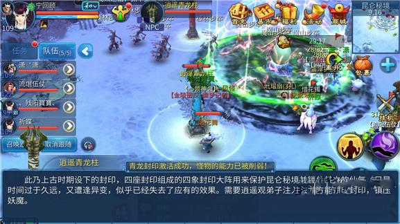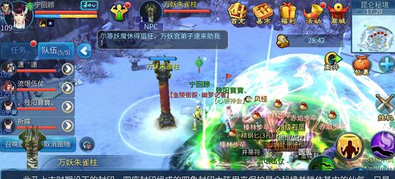 然后队友们就可以站在不同的柱子上激活封印了!封印激活可以降低怪的攻击防御等,有利于过关。如果实在凑不齐四大门派也是可以打过的,只要装备过硬都不是事~(果然装备才是王道)
