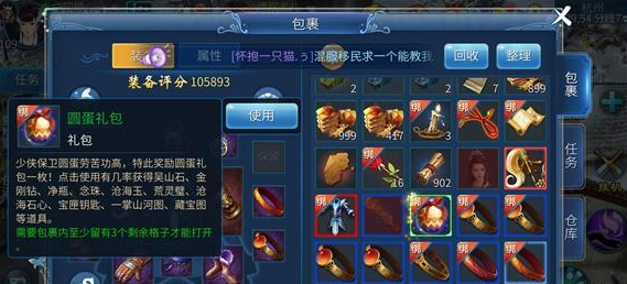 任务完成后获得道具圆蛋礼包,可以开出一掌山河图、吴山石等道具。