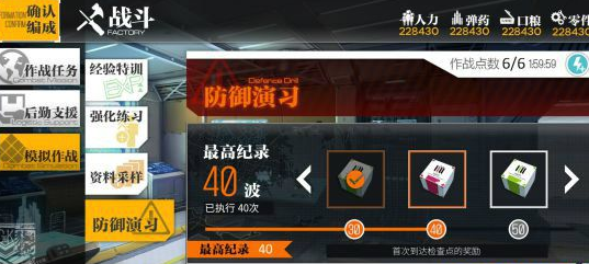 1、防御演习是一种新的【模拟作战】方式,玩家需要消耗5点作战点数进行挑战。
