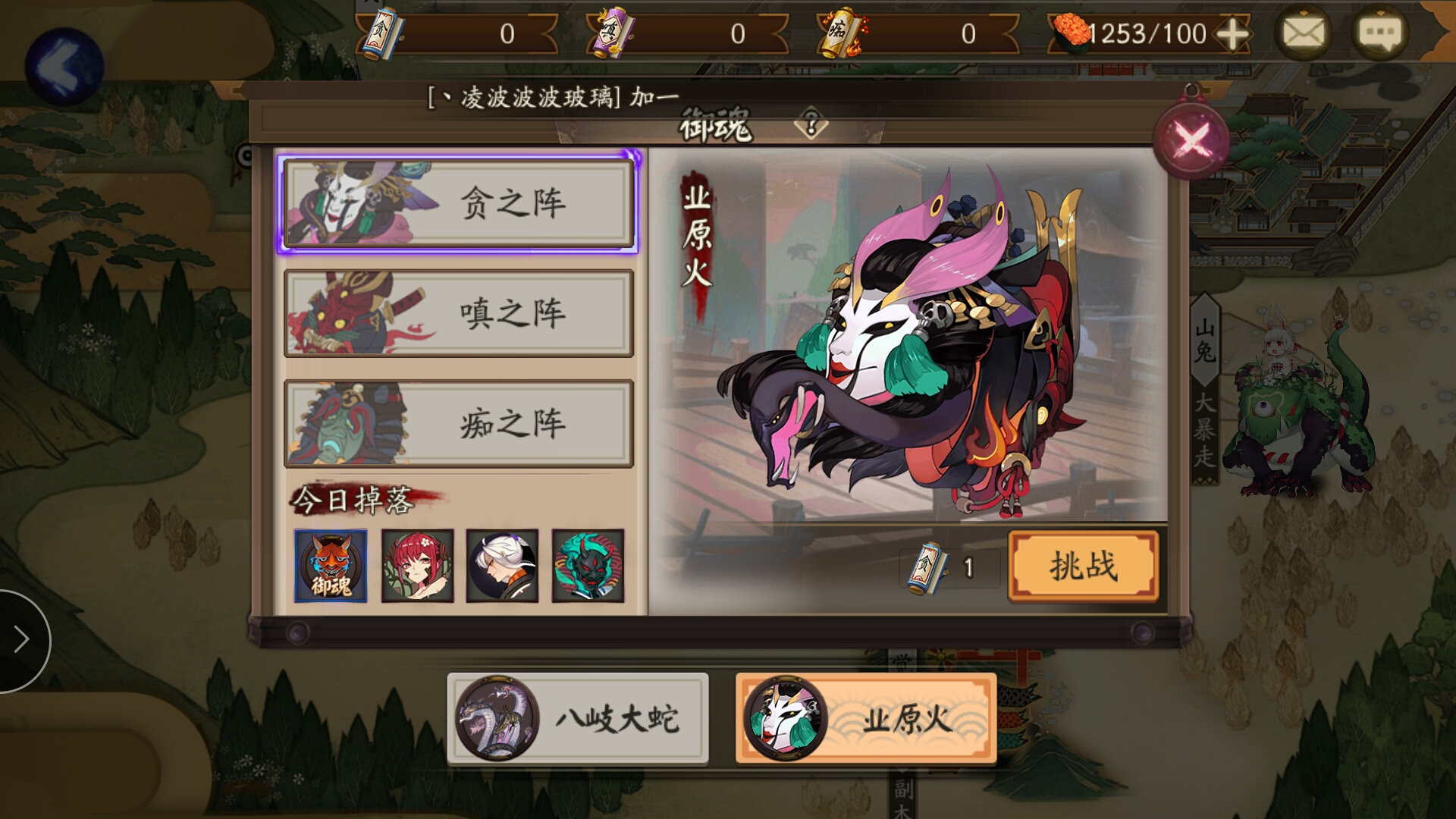 而挑战业原火的凭证分别为贪念之券,嗔念之券,痴念之券,需要通关普通御魂副本有概率获得。