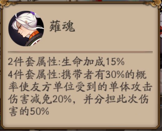 [四件套] 携带者有30%的概率使友方单位受到的单体攻击伤害减免20%,并分担此次伤害的50%。