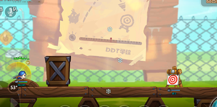 而第一个箭靶其实难度也不大,位置依然可以不变,然后接下来把角度调整到53度左右,然后再把蓄力的力道调整到45就差不多可以击中了,当然差个一两点也是可以的。