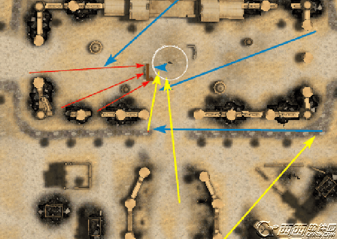 如图中所示,最右边的黄色线路,可以一定程度压制蓝色方3点钟方向的输出,从而保证己方中路的火力能够得到最大的发挥。当然视对面的部署,选择别的侧翼进行突击都是可以的