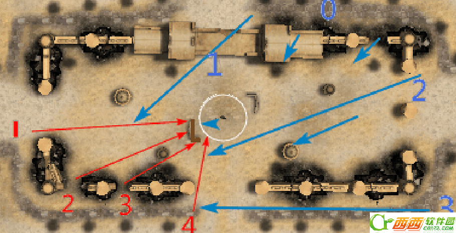 此时如果一切顺利,我们就会看到图示中的场景,红色方主要的四条进攻旗圈的路线,左边编号“1.2.3”的三条只能面对一个漏出墙体的炮塔,均不能很好的对其进行打击,而如果强行进入场地或者进行手动微操瞄准,1号甚至0号位置的蓝方均可对其进行火力覆盖。