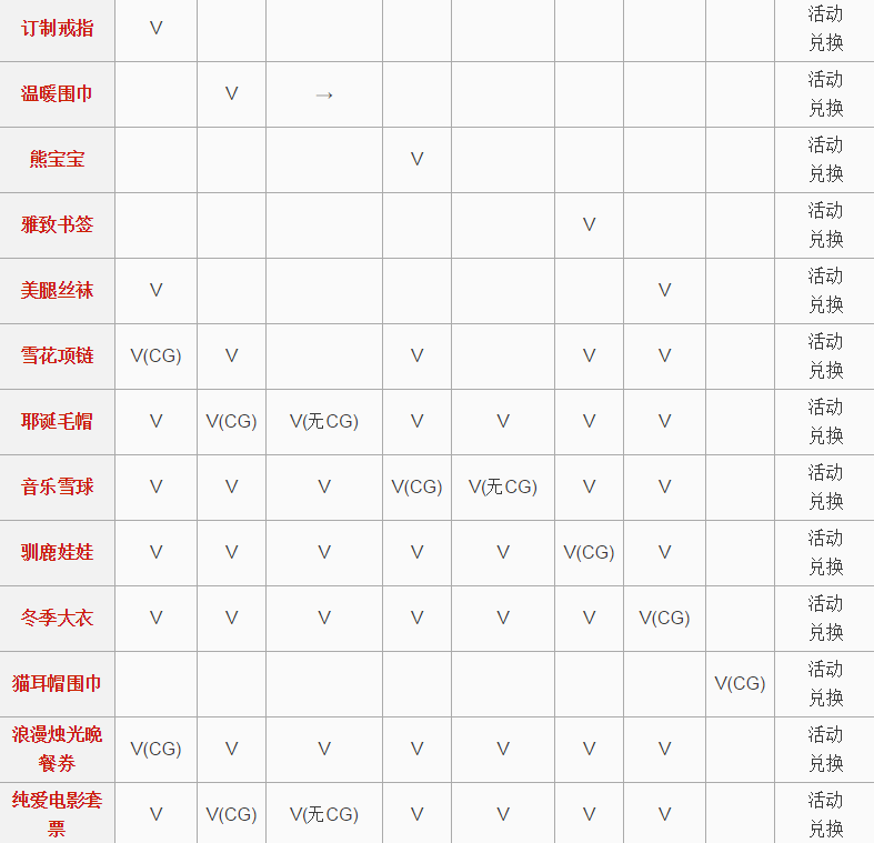 ※ V=好感上升(括号CG代表此物品给赠送对象可得CG) →=好感不变 ↓=降好感