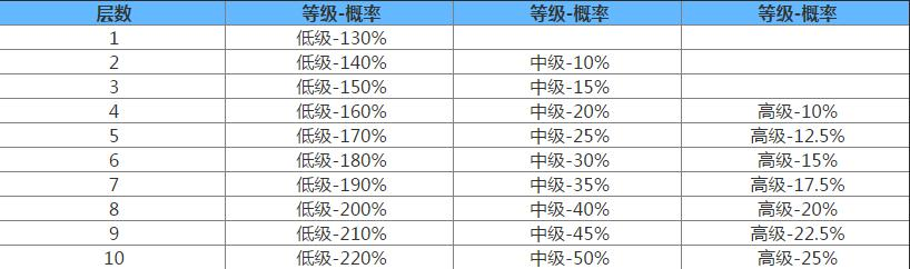 可以看出,4层开始掉落高级,在10层的时候,一次可以的掉落2个低级材料,有一半的概率出中级,高级的有四分一。所以越高层,掉落的物品越好。