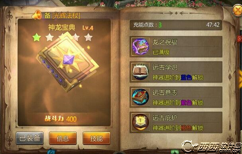 神器推荐使用神龙宝典,容易获取,而且可以爆发出双倍的战斗力,使用方便,在早期,要是可以提升品质开启出第二个技能,那样挑战深渊之塔可以更加省时间,通关更快