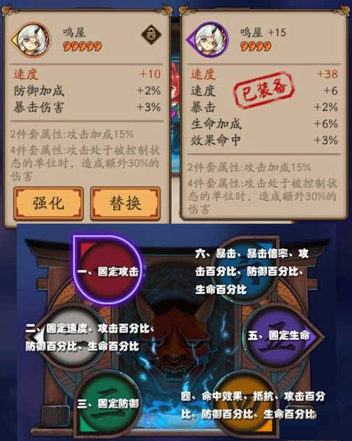 4星~5星:过渡,经常有人瞧不起4星,但其实4星和5星最终属性只差了2%,所以如果有好的副属性4星是完全可以超越差属性的5星的。在这个阶段,由于产量很大(玩过一段时间之后你会知道- -)每个御魂都可以反复强化尝试以追求更好的副属性,强化的小诀窍是,在一个初始满属性的御魂上,如果+3+6的时候都强化了同一条副属性,那么很可能之后的几次副属性强化都会加在那一条上,如果平时强化的时候遇到请务必关注!