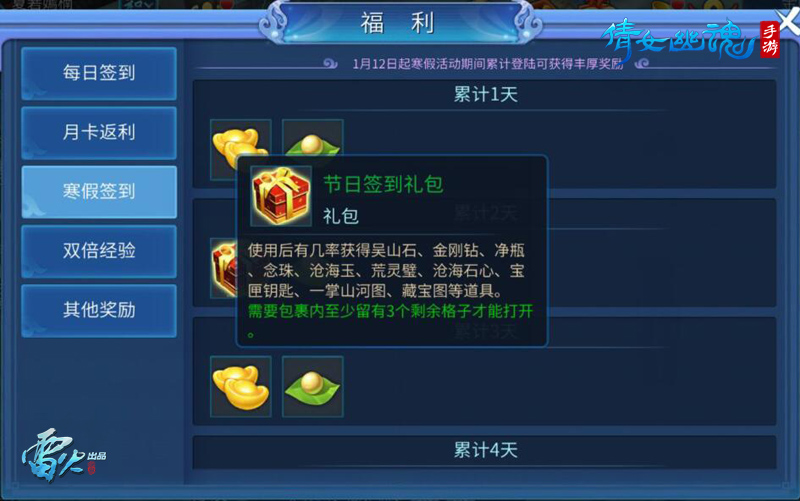 紧张的学期接近尾声,寒假将近你打算怎么过?1月12日~2月6日,倩女手游超长时间、福利满满的活动即将来袭,每日签到领取海量元宝、大力丸,节日签到礼包更有机会开出金刚钻、宝匣钥匙等珍贵道具。化身呆萌灵兽挑战全新趣味副本,与灵兽一起闯荡三界赢取丰厚奖励!