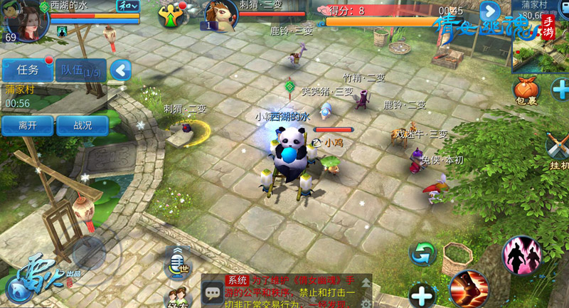 “灵兽大乱斗”共分为两个部分,第一部分需要组队进行,进入趣味副本后,少侠将随机变成一种呆萌的神兽模样,在场景中使用“跟随”技能捕捉场景内的灵兽,让他们跟随在自己身后获得积分,挑战时间结束后,结算每人的总积分。少侠们不要贪心去捕捉相同的灵兽,否则会落跑扣除积分。