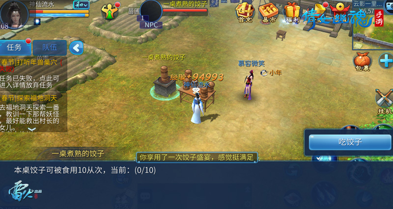 新年期间,福地洞天降临三界,通过金陵NPC包打听进入福地洞天击杀副本中的三个boss将获得大量经验及珍稀食材,珍稀食材还能在副本中通过采集获得,集齐10个可在包打听处兑换什锦虾仁和灌汤明珠秘制食材。拥有一定的食材后,少侠就能在家园中制作一桌美味的饺子宴,召唤朋友共享饺子宴,便可获大量经验!