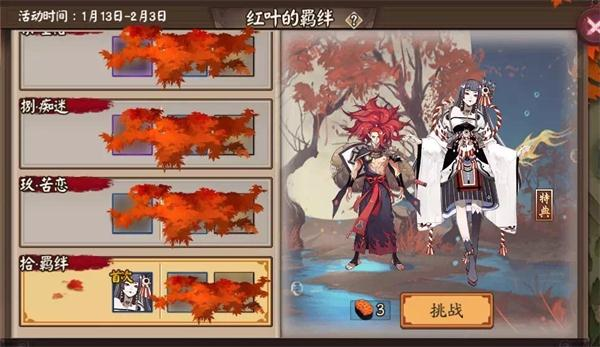 副本玩法:红叶挑战副本分为10层,仅限单人挑战,并可重复挑战。通关每一层都会获得相应奖励;首次通关第8层获得红叶头像框;首次通关第9层获得御行达摩;首次通关第10层获得红叶皮肤·人形之舞。(皮肤画手@妖魔君是茶水妹 )