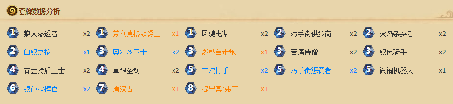 从构思上看,狼人和白银枪似乎是在针对了当前的蹩脚海盗,在前期能与海盗体系套牌能有一战之力,满编的二流打手和森金持盾卫士也是不断的在克制快攻。