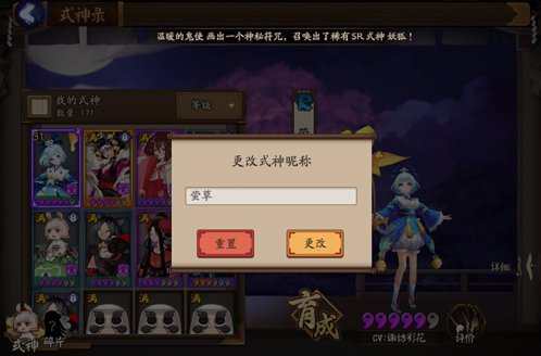 其实式神改名这个功能操作起来是非常方面的,玩家只要进入式神录这个面板,首先在我的式神中找到自己想要改名的式神,让它出现在右侧。直接点击式神的姓名,就可以出现更改式神昵称出现了,玩家可以命名一个好玩一点的名字,如果达不到自己的效果还可以进行充值。