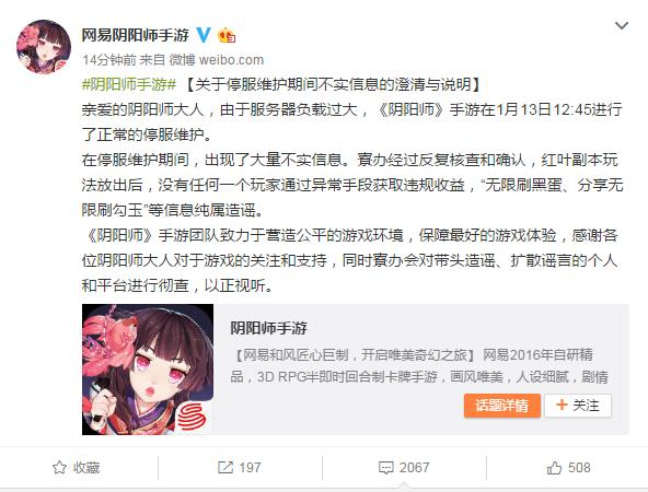 阴阳师官方微博发出声明,维护不实信息的澄清公告,接下来西西小编将要为大家带来关于阴阳师手游bug的相关信息,希望对你有所帮助。
