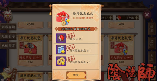 阴阳师每月运势礼包上架之后,之前的每月优惠奖励内容依旧会持续发放。