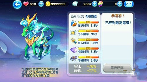 圣麒麟本身是具有比较高的飞星得分的,破坏障碍物爆出飞星之后,冲刺期间不仅仅表现得分会增加,还能把普通的飞星变成勾玉飞星。搭配幻彩羽翼之后,爆出的飞星就会全程自动的吸附,同时还获得5倍的踩怪得分。这个属性增加可以说让圣麒麟在一次的崛起。