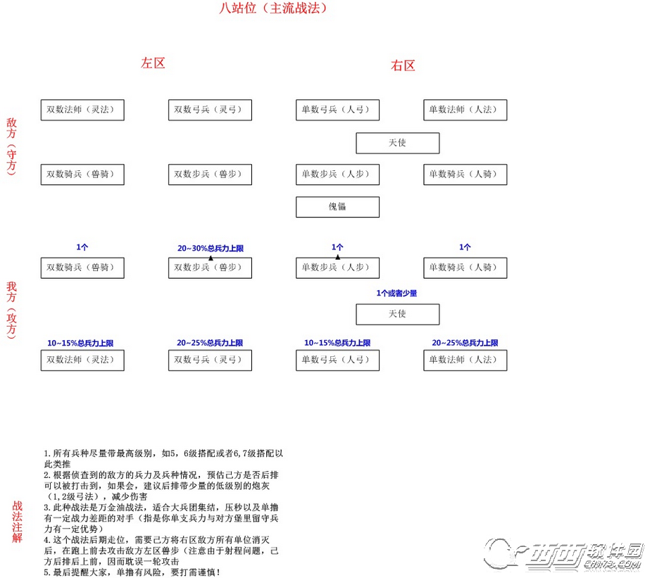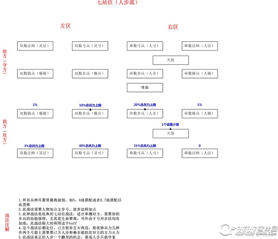 战法注解:此种战法是经典的七站位战法,适合单撸对方,需要你的步兵的技能强悍,尤其是生命要高,另外由于弓对步法均有加成,此战法极大的利用这个buff。