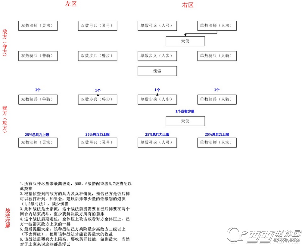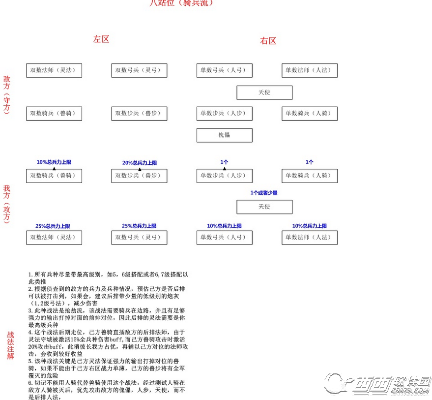 战法注解:此种战法是打劫流,该战法需要骑兵在边路,并且有足够强力的输出打掉对面的前排对位,因此后排的灵法需要是你最高级兵种!