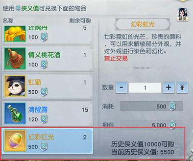 对,其实我就是为了买幻彩虹光!!所以才每天去刷侠义值,日复一日,年复一年。【战功其实也是为了买这个玩意!!】