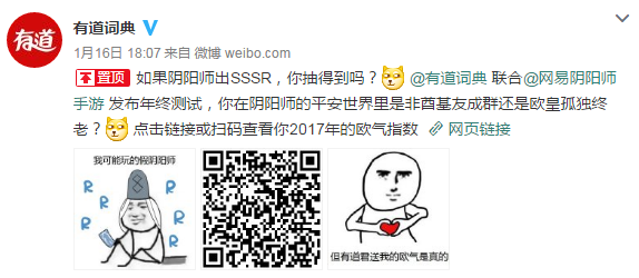 阴阳师你2017年的欧气指数在哪测,你2017年的欧气指数怎么测。今天小编刷微博时看到有道词典发的消息啦,有道词典联合阴阳师手游发布年终测试,玩家可以测试你2017年的欧气指数哦,不少小伙伴都想看看自己的欧气如何,阴阳师你2017年的欧气指数在哪测,你2017年的欧气指数怎么测,西西小编来为大家介绍。