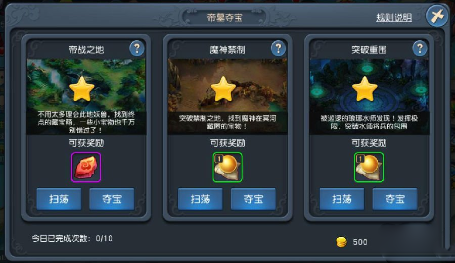 3.每次帝墓夺宝会刷新出3个不同任务给玩家选择,玩家可以选择其中之一闯关,闯关成功后即可获得对应奖励。