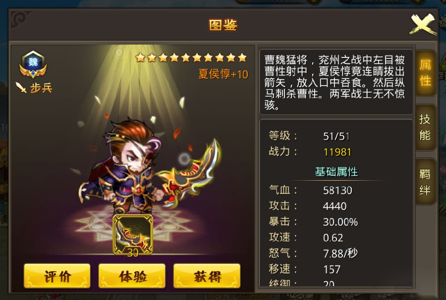 天赋7:暴击7,提高14%暴击率,配合被动技能-怒视,夏侯惇和关羽一样,近乎疯狂吸血...