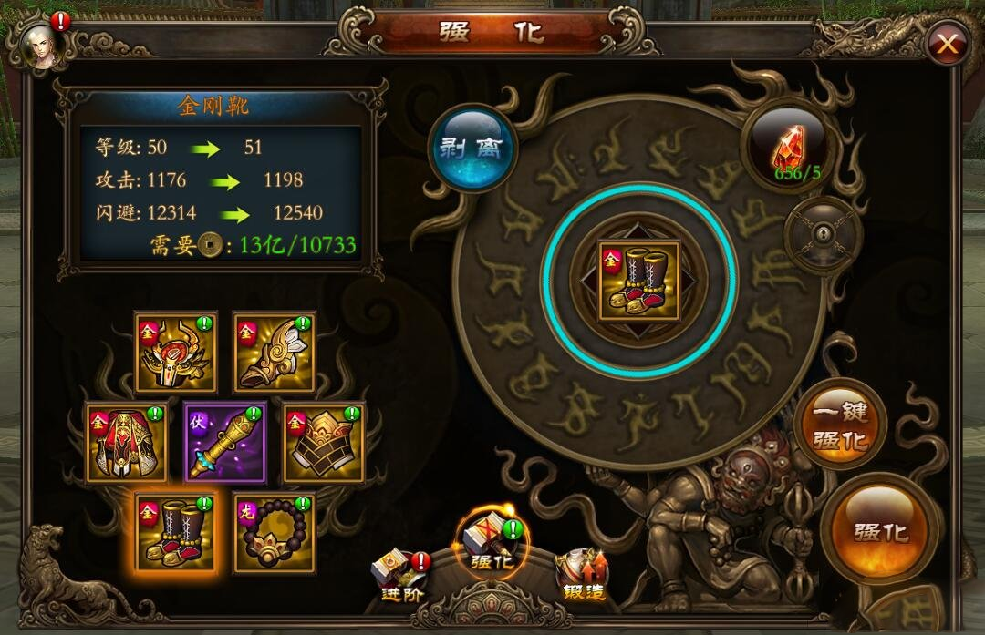 部位装备以颜色区分为四种不同的品质,分别是绿色<蓝色<紫色<橙色,橙色最佳,紫色其次。不同品质的装备随着进阶等级的提升又细分为十个品阶,同时同一部位的装备还区分有不同的套装属性,比如伏魔套装、金刚套装等。在游戏过程中,玩家将会收集到不同品质的装备,在选择强化和进阶装备时,应按装备品质高低优先强化!