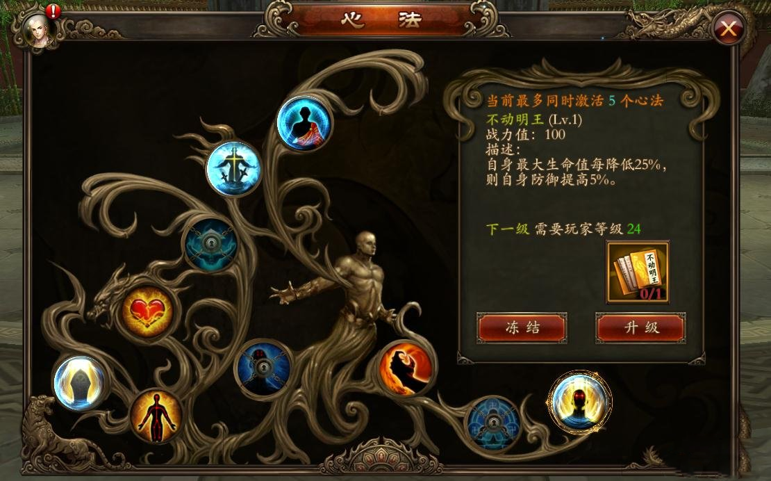 在面对高伤害敌人时,主角装备不好的情况下,血量会时常被打到很低,甚至会被直接干掉,所以换上血量低于一定百分比就能提升自身防御的心法技能会大大提高存活率。若在副本场景中,还可把“天佛掌”换成“逆命战天”,最后再带上“擒虎降龙”,提升自身防御力的同时还能保障死后重生的机会,力争S评价。