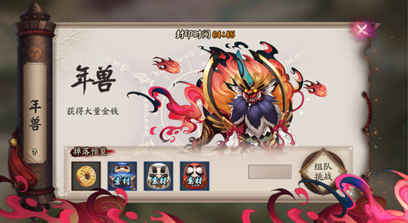 成功驱赶年兽,可获得金币,并有概率获得达摩契约书·碎片,达摩契约书。