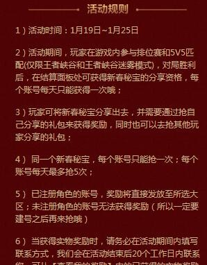 1、活动期间1月19日-1月25日,只要参与5V5匹配或排位,胜利后在结算页面就有机会获得新春秘宝分享地址