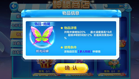 不过如果小伙伴们已经有了其他的不错的拖尾了,那么小编就不建议大家入手斑光闪蝶了。之前天天酷跑的光环拖尾更新速度很慢,现在更新得实在是太快了。想必用不了多久,又有全新的更厉害的出现了,所以其实没有必要。当然啦,如果你钻石多的话,还是可以随便买的,因为这款新拖尾除了上架充值商城,通过钻石1888也是可以购买到的啦。