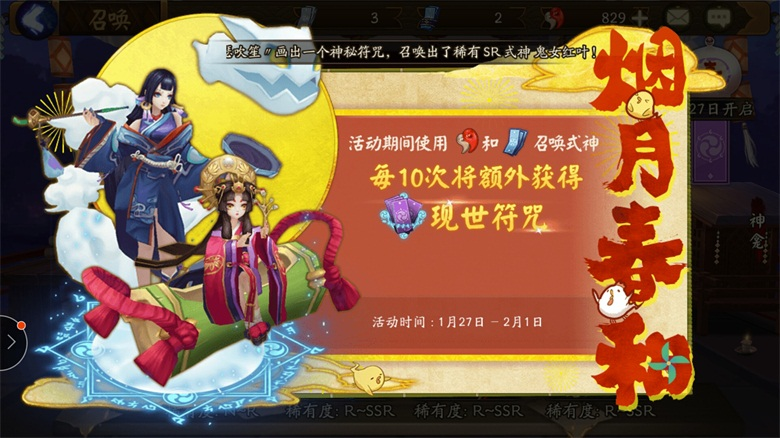 活动期间完成每日任务,可额外获得一张现世符咒,现世符咒可用在现世召唤中与式神缔结契约