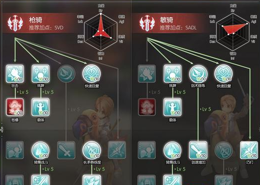 这两种主流的加点方案就是枪骑和敏骑,枪骑或称体骑,属性点上主要注重体质、其次力量以及灵巧,技能上擅长用长矛对大型魔物造成多段或者范围伤害。敏暴骑则注重速度和闪避,主要加点敏捷,其次力量、灵巧或幸运。技能上更多的是学习被动技能以及加攻速buff状态的技能,然后快速、且致命的普通攻击来一一击破敌人。