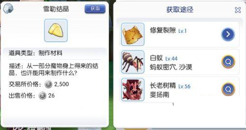 1.击杀白蚁、黑蚁、长老树精获取雪勒结晶。白蚁黑蚁建议玩家40级左右再去打,在梦罗克右边的苏特拉特沙漠和蚂蚁洞穴;长老树精建议玩家55级左右再去打,在斐扬南部。击杀魔物掉落雪勒结晶的几率比较低。