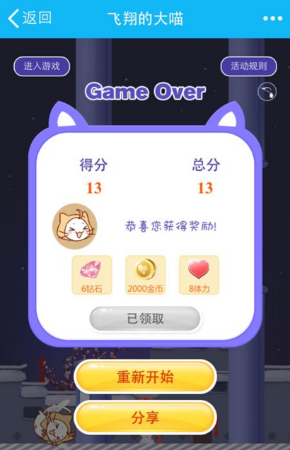 在游园会界面点开【飞翔的大喵】,把链接分享给朋友,朋友玩了10分。