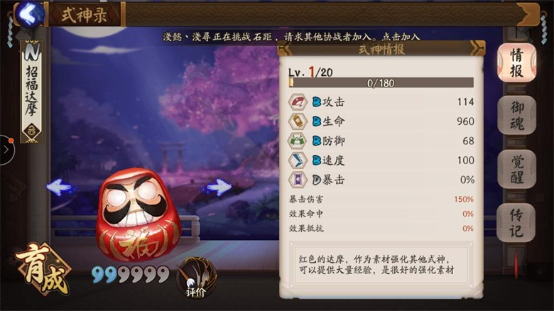 黑色达摩!目前三个达摩最稀有的,可以强化任意式神的技能1次,无论是SSR还是SR卡都可以使用,如果前期没有好的式神,建议先留着,等出了SSR或者稀有的SR式神再去升级技能。