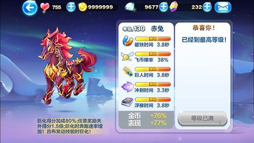 最高等级130级,磁铁时间3.8秒、飞币爆率38%、巨人时间3.8秒、冲刺时间3.3秒、浮梯时间3.8秒、金币加成76%、表现加成77%
