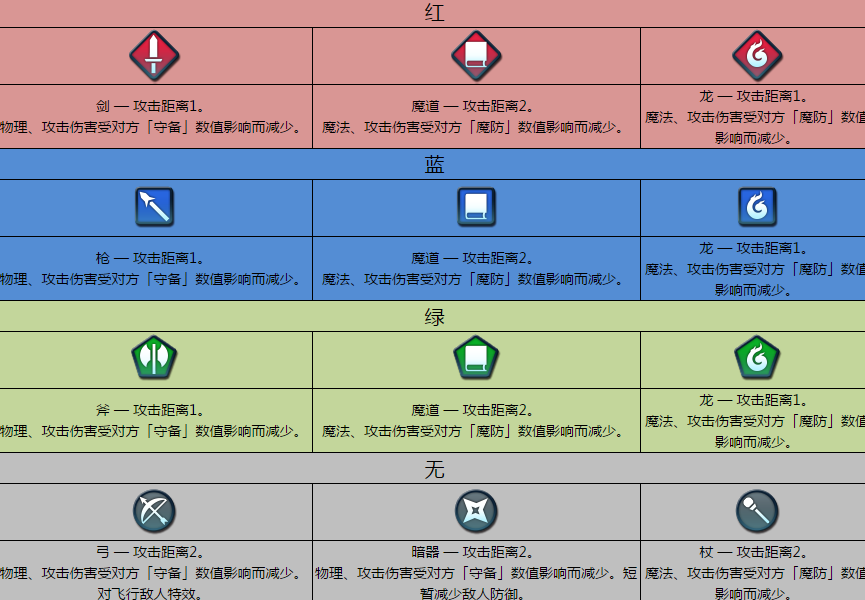 属性按颜色分类,分为红、蓝、绿、无色四种,目前每种属性皆有三类兵种。