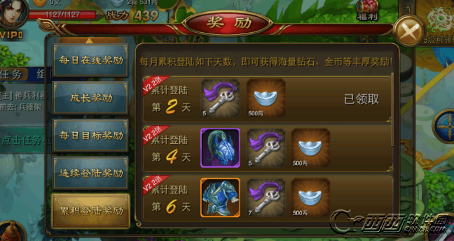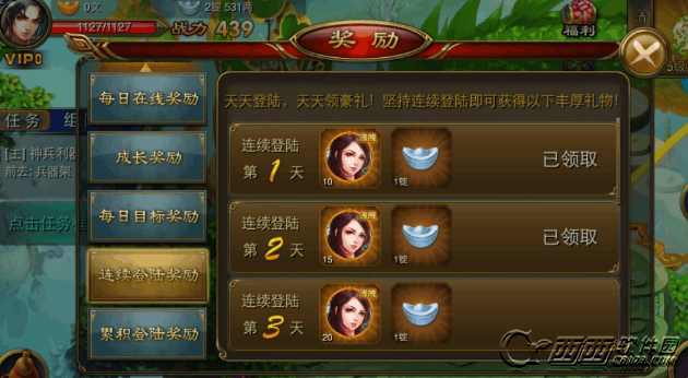 第一步当然是进入游戏了,不过创建了角色后不要急着开始任务哦,注意屏幕右上角有个奖励图标,记得先把可以领取的奖励(连续登陆奖励与累计登陆奖励哦)都领取了,因为我们后面马上就要用到这些奖励了。