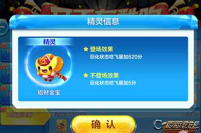 招财金宝是飞星方面的加成,而且是必须要在巨化状态内的飞星得分才有加成,因此如果要搭配高分的话,最好是要选择可以在非超级奖励关卡中有巨化效果的人物坐骑装备哟