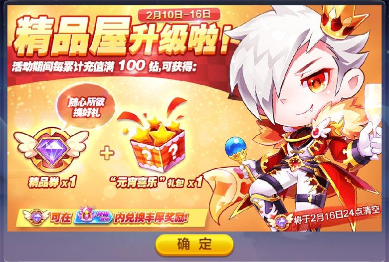 活动内容:活动期间,游戏内每日累计充值满100钻(不含返利部分),送精品券*1,不限次数,当日充值额度每日00:00刷新,精品券可在神秘商店精品屋兑换超多壕礼!